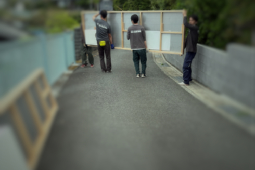さらに、玄関からは人力で搬入することになります。現場には足場も残っており、さらには階段もあり、搬入難度はたいへんたいへん高いものになったのでした。