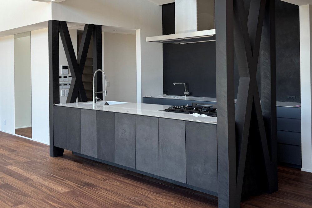 アイランドの側面やリビング側台輪も同様にモールテックスで統一して塗っています。