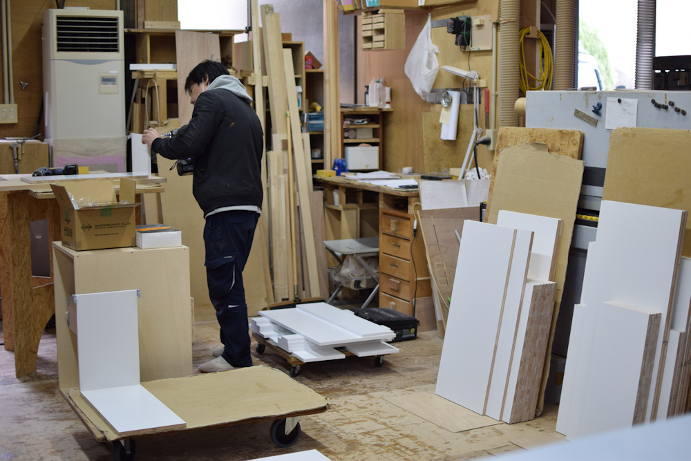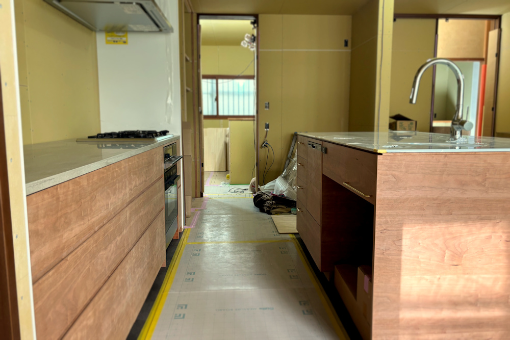 今日はシンクのあるアイランドカウンターとラタンを張った建具の取付です。前回来た時に現場の寸法は確認していたので、どうにか予定時間内に作業を終えることができて、私たちの作業は無事に完了。