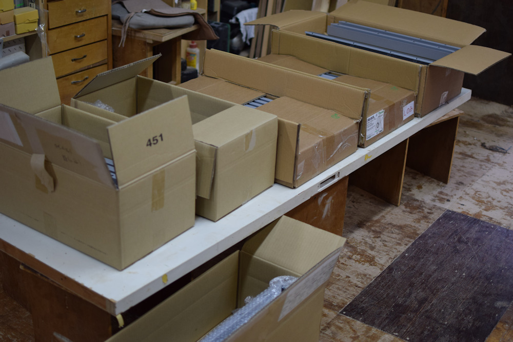 ですので、搬入時にステンレス天板が傷まないよう、またたわまないよう木枠で天板のまわりを固めて補強しての搬入となりました。