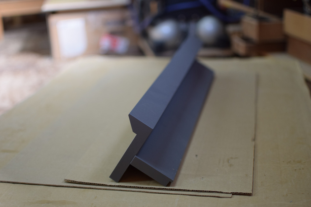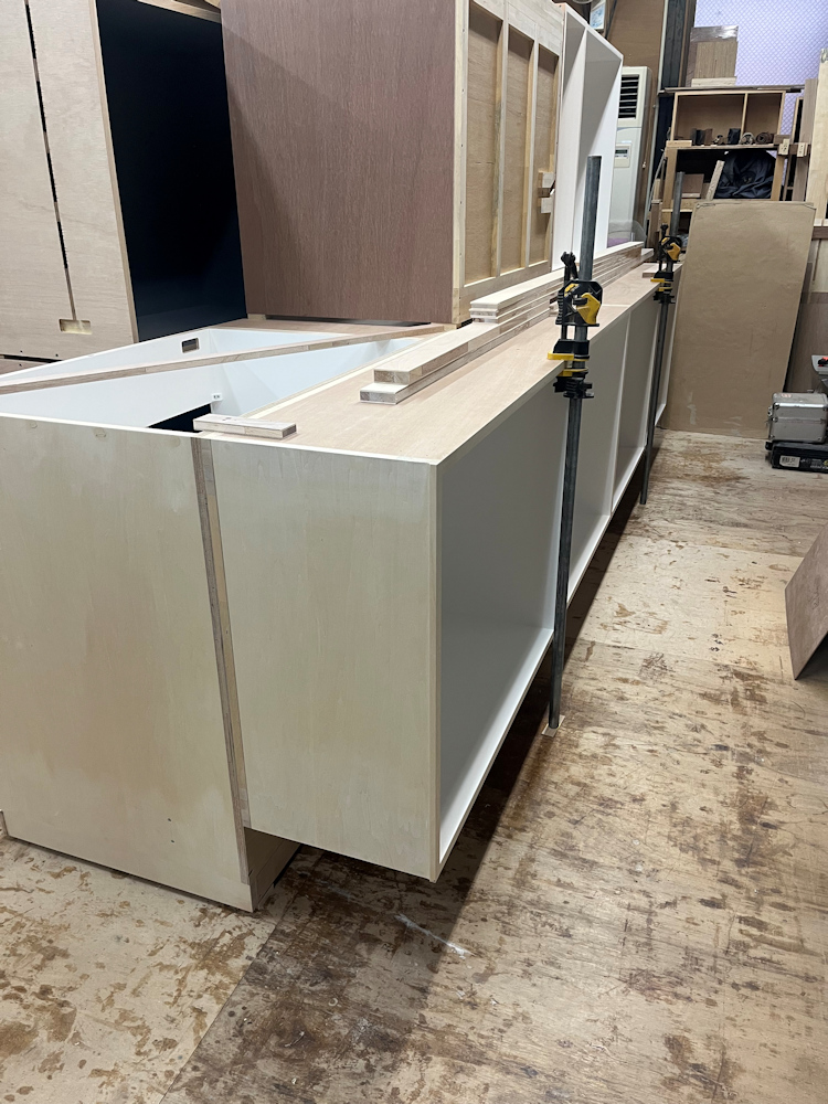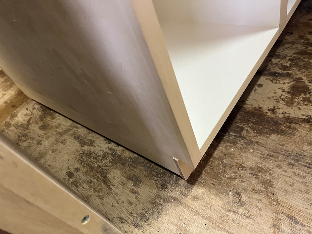 こちらが拡大写真で、側面の巾木が2㎜出っ張っていて、さらに本体の前に張ったシナも手前の10㎜だけ2㎜出っ張っています。その奥のパテを入れて白くなっているラワン合板にモールテックスが塗られると、塗装された巾木やシナと平らになる、という感じです。伝わりますでしょうか・・。