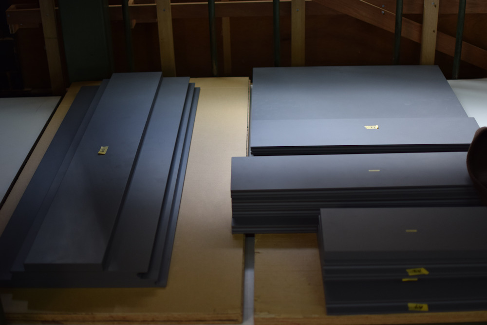このような塗りつぶし塗装の時はいつも専門の塗装屋さんに依頼して塗ってもらっています。ですので、塗り包むことで面の柔らかさも出るので仕上がりはやはり色味、質感ともに化粧板とは違った上品な仕上がりになります。
