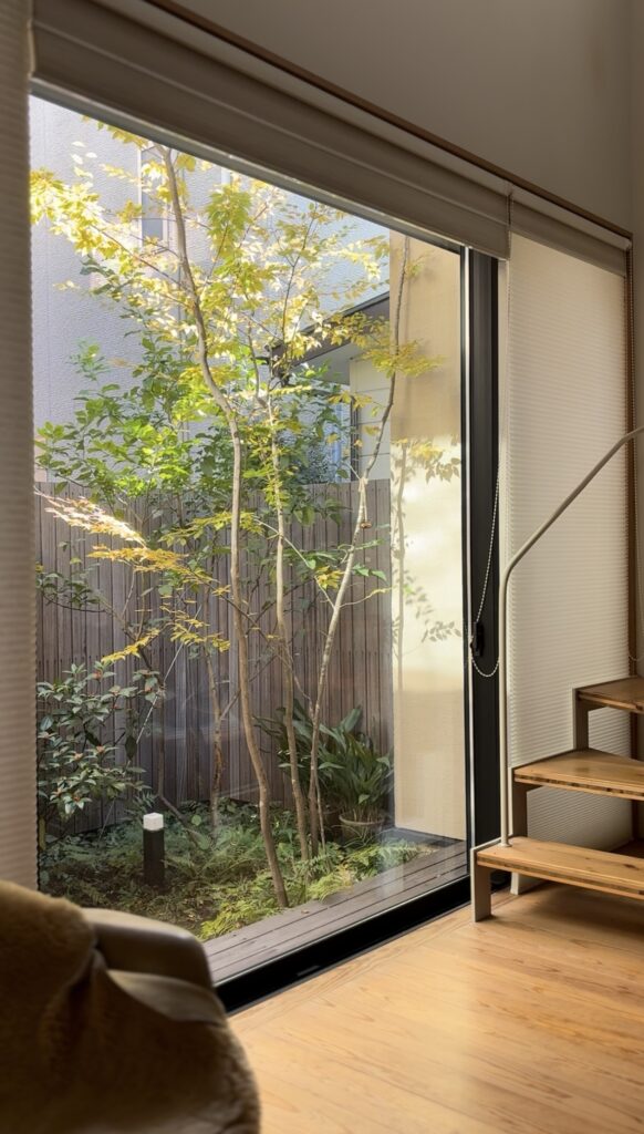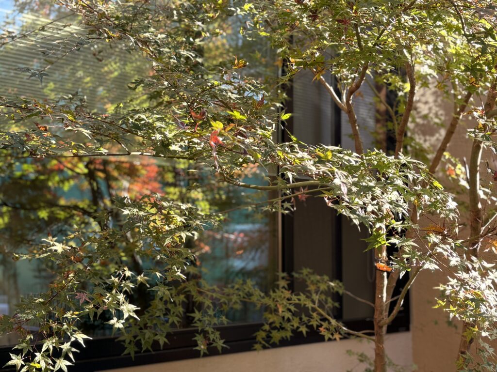 この紅葉はお家を建てた時に植えたので、6年目。一番背の高い枝の部分が窓枠の高さくらいだったのに、毎年剪定していてもそれを超えるほど大きくなって、シェードを上げても立派な目隠し効果を発揮してくれています。