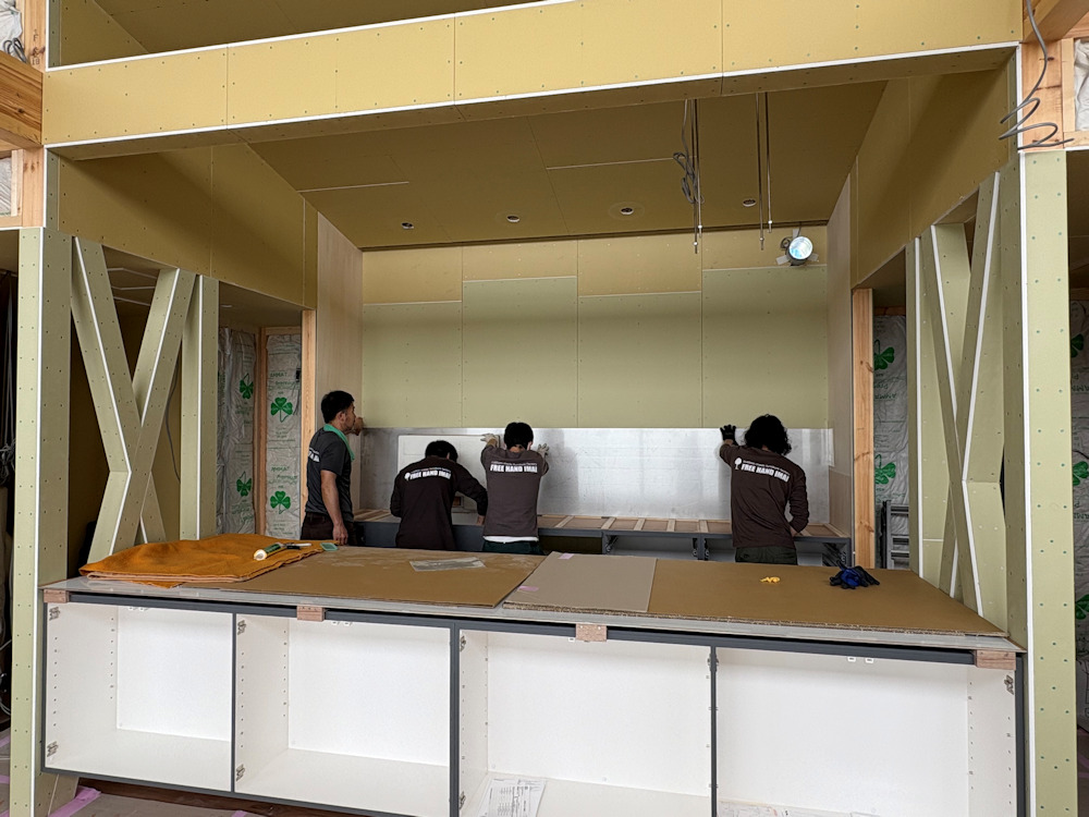 もう少しすると全容が見えてくるので、どのような空間になるのか楽しみです。とくにダイナミックな仕上がりの天井とどのように相まって見えてくるのだろう。