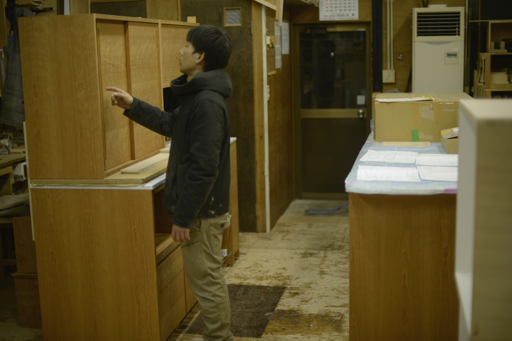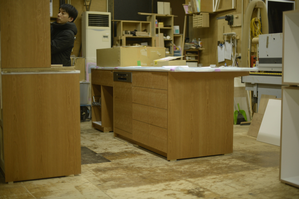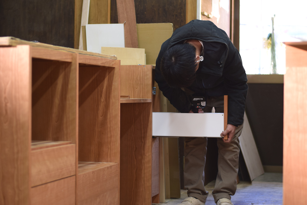 制作の担当はヒロセ君。ヒロセ君はこのあともやはりチェリーを使ったキッチンを作っていて、そちらも間もなく納品です。