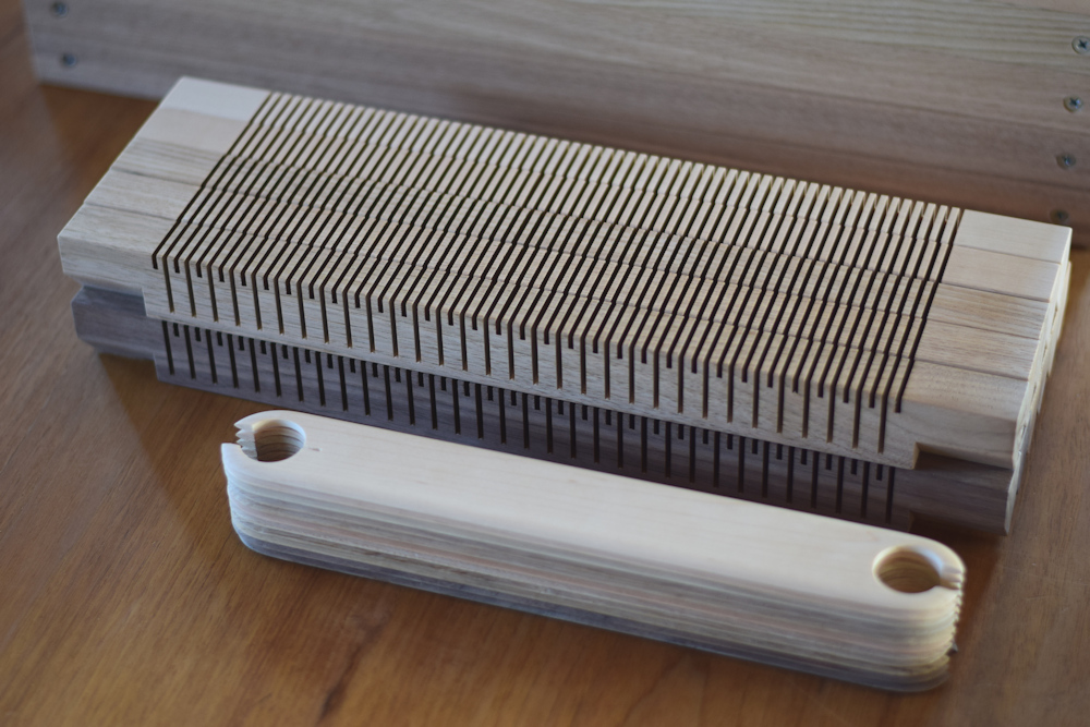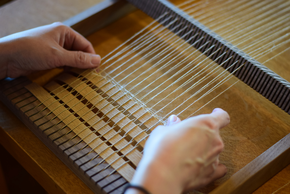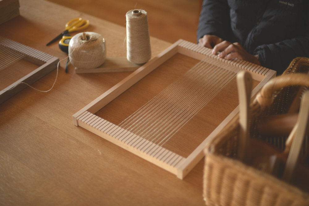 ここでフリーハンドイマイ製の織り機の登場です!最初に麻糸を通していきます。