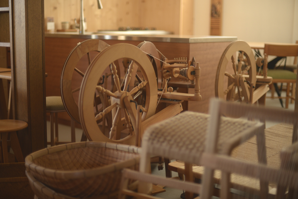 おお、すてきな糸車が5台もショールームに運び込まれました。こうして所狭しと運ばれてきた他の道具も含めて眺めてみると、あらためて手仕事にはいろいろな道具が必要なことがわかります。