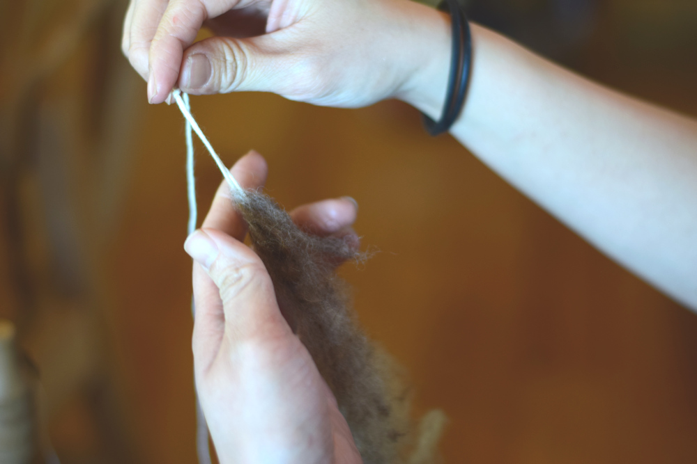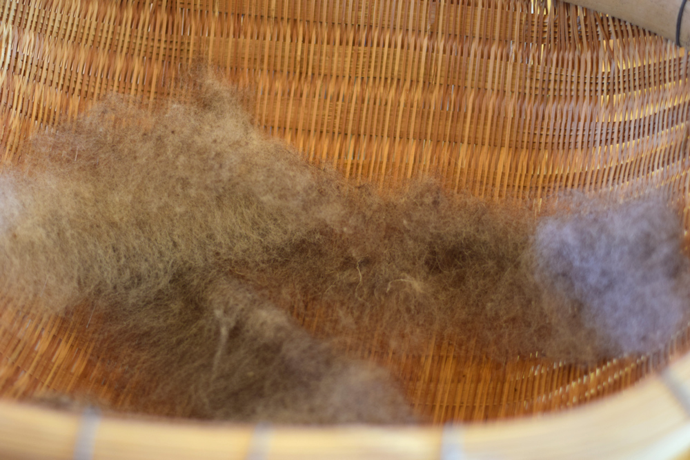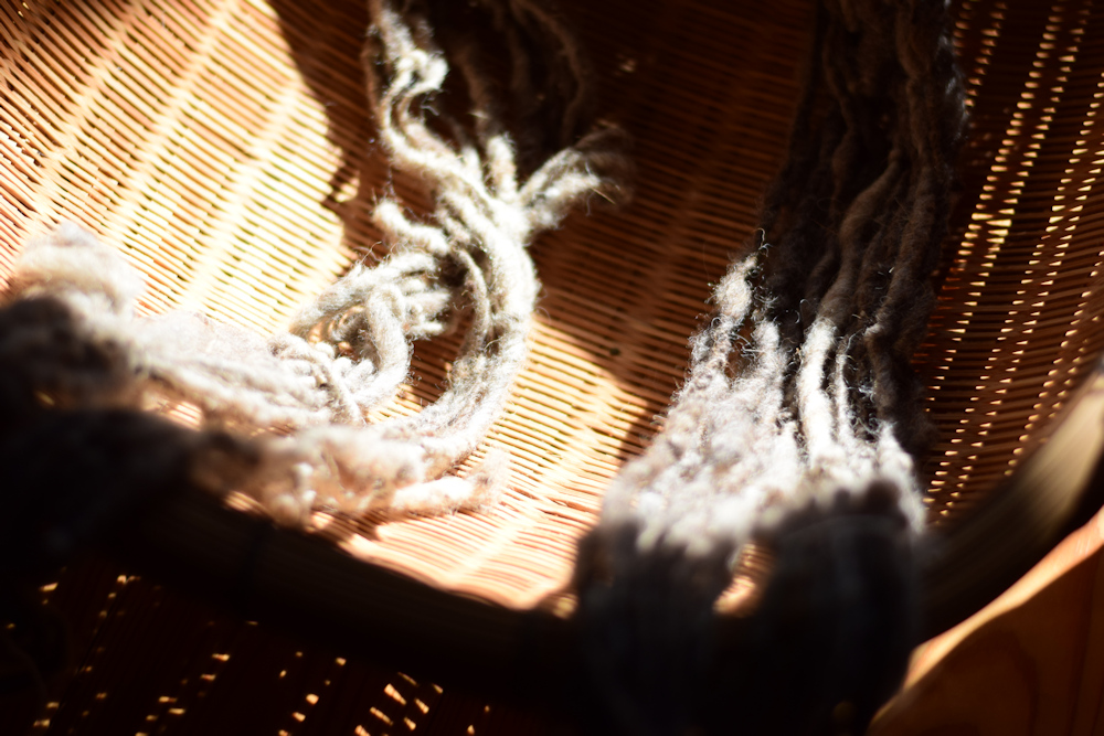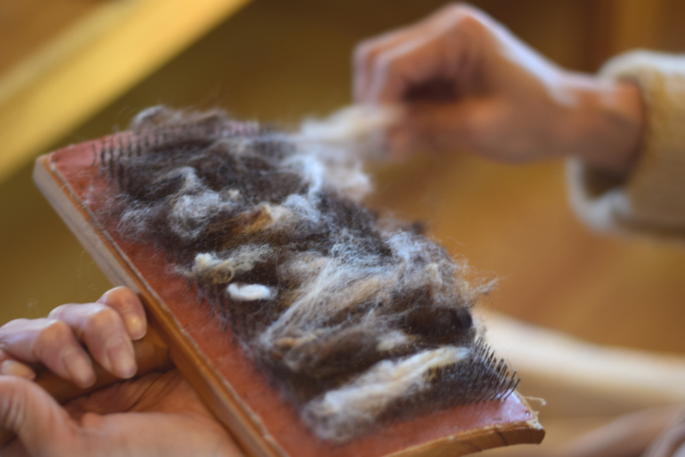 こげ茶と白のMIXの糸はジャコブという羊の毛だそうです。カーダーという道具を使って羊毛をカーディングしていきます。この毛流れを整える作業がとても難しかったです。