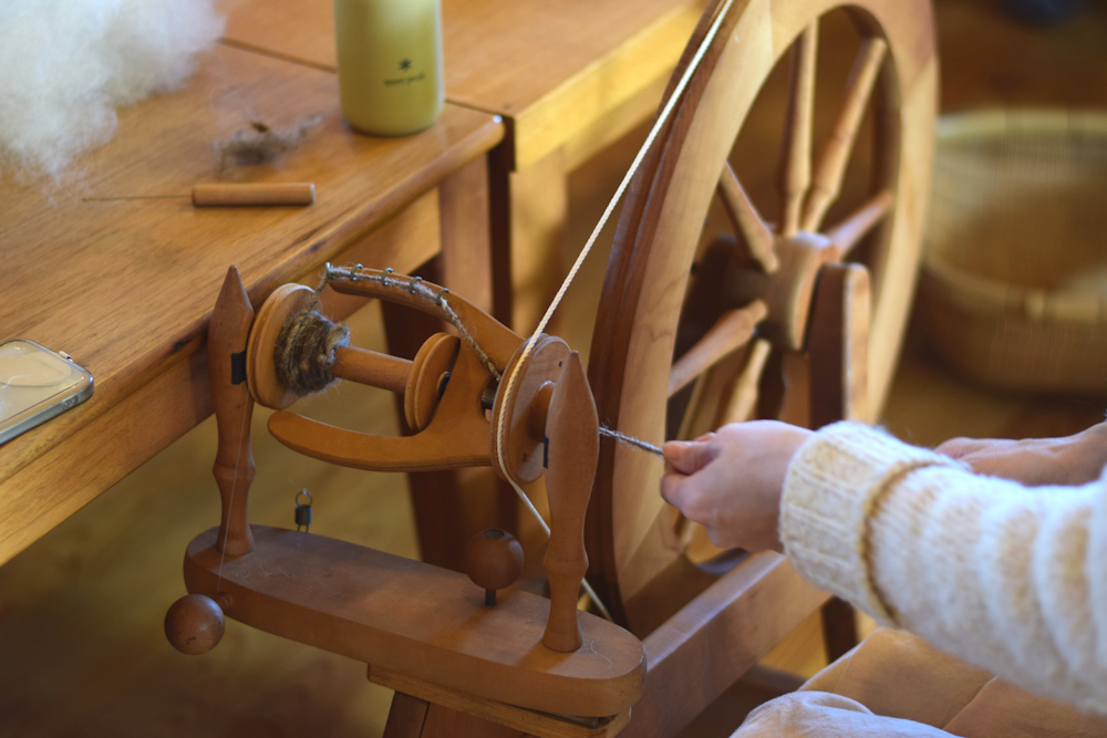 糸車に出来上がった毛糸をかせを使って巻き取っていきます。初めて見る手仕事の道具に感動しました。