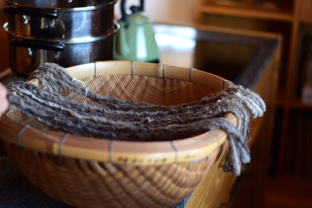 糸車から巻き取った羊毛は蒸してよりを安定させるのでそうです。