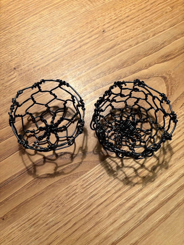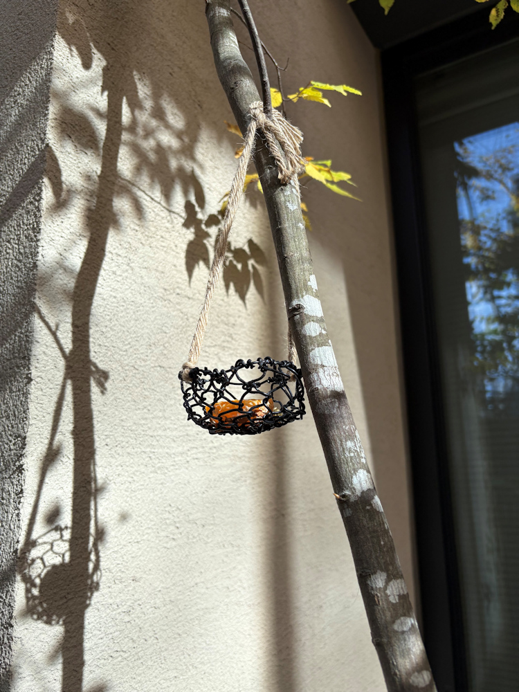 均一ショップで買ったかごをぶら下げてミカンやリンゴを入れていたのですが、雨でぬれて、食べ物も濡れるとカビが生えたようになってしまい、ワイヤーでかごを編みたいなと思い、材料だけ買って家に置いておいたのです。