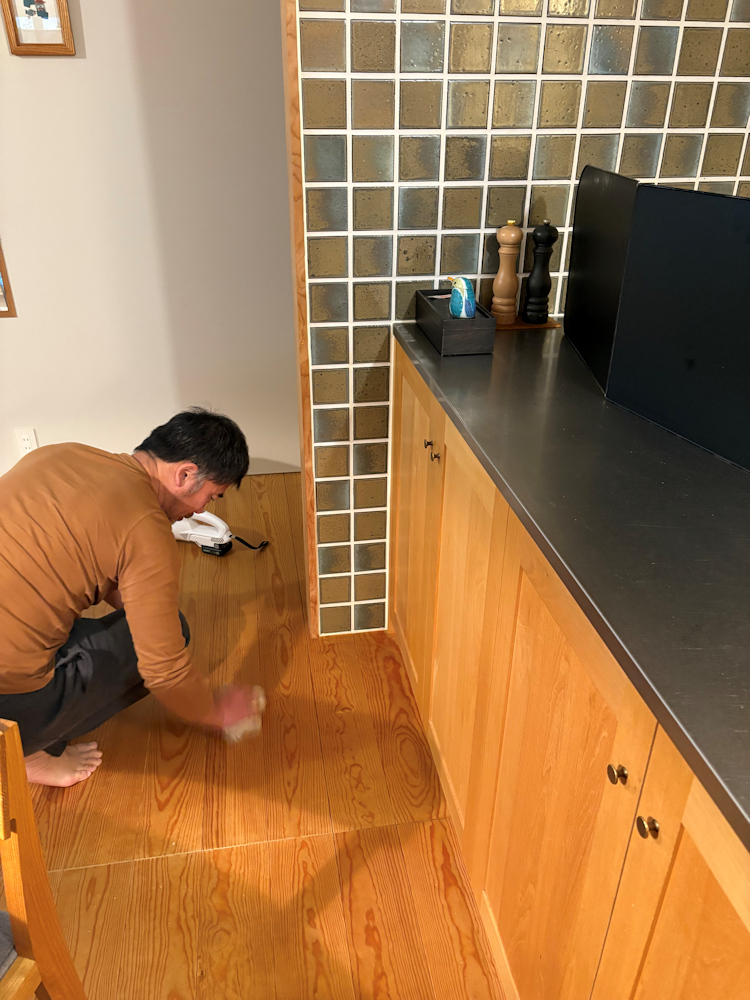 ひどい所には台所で使っているヤシの実洗剤を使いながら拭いてくれてサラサラになりました。床がサラサラだと気持ちがいいですね。暮らしていれば汚れますから、自分がお掃除して管理しやすい素材が良い気がします。