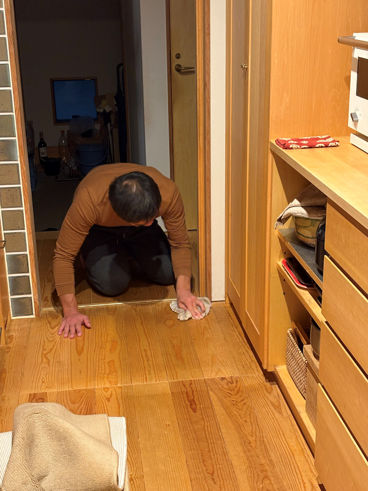 コンロ周りの床がべたつく気がするということで、ダイスケさんが拭き掃除をしてくれました。