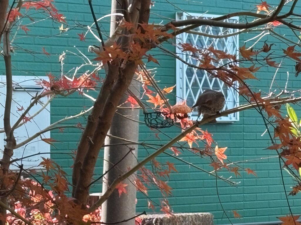 麻ひもで枝に結び付けて餌を置いておくと、鳥ちゃん達が来てくれます。