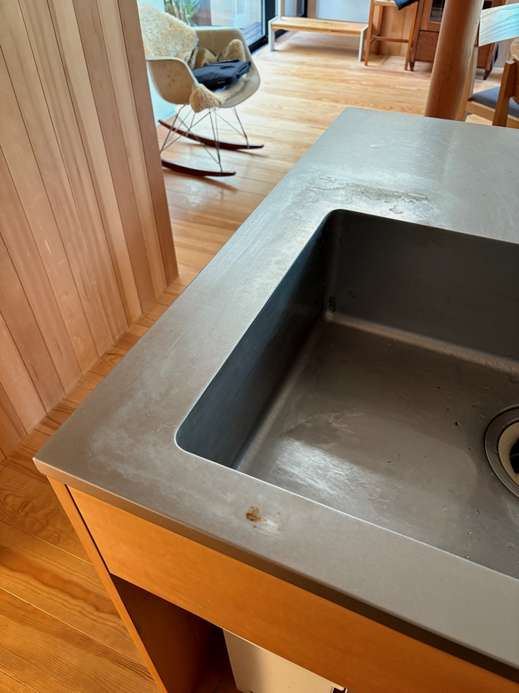 シンク側の天板はシーザーストーンで、コンロ側の天板はステンレスという組み合わせ。チェリーがさらに日焼けしてくるともっと良い印象になりそうです。