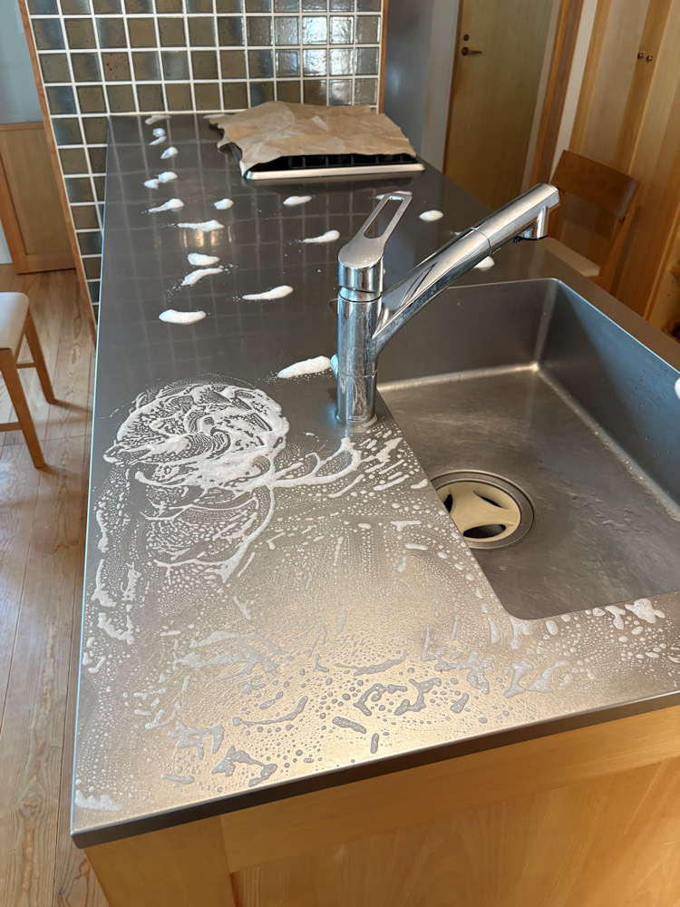 ステンレス天板もダスキンのステンレスクリーナーを進めていますが、この日はお掃除の後すぐにお節づくりを始めたくて、コーティング効果は求めていなかったので、使いませんでした。拭き上げが足りてないと水拭きした時の水分をはじいた水玉模様の跡が残ってしまうことがあるからです。