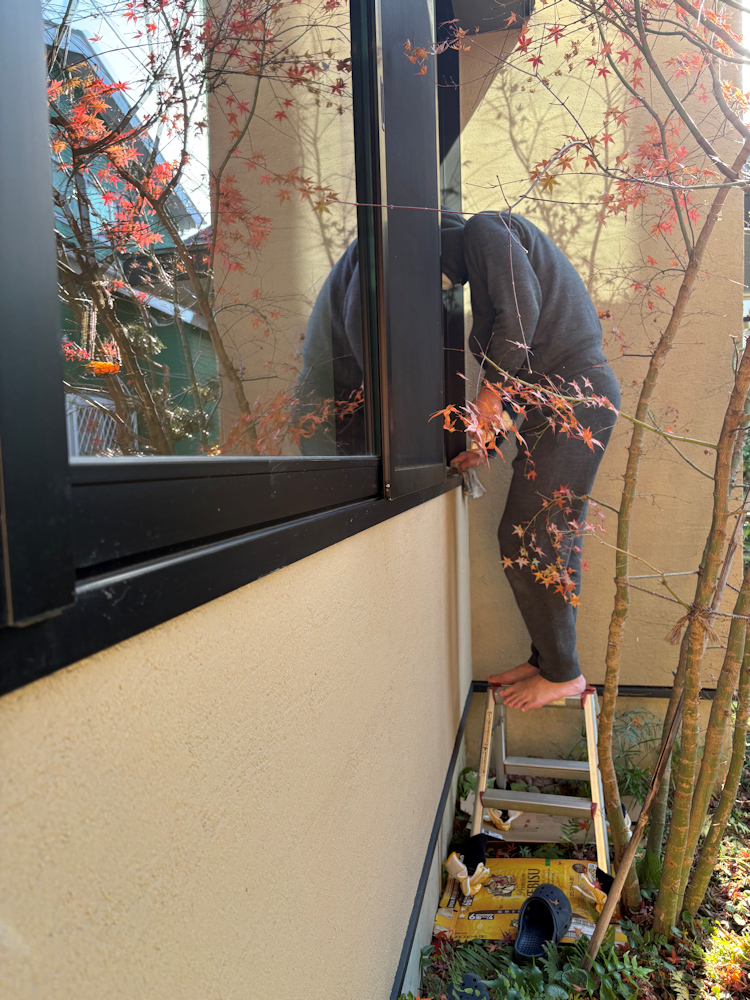 「細い枝が折れちゃうかも。足元の植物踏んじゃっていいのかな。」と言いながら、窓ふきを進めてくれているダイスケさん。窓の近くに植栽があるとそうなっちゃいますよね。皆さんどうされているのでしょうか。