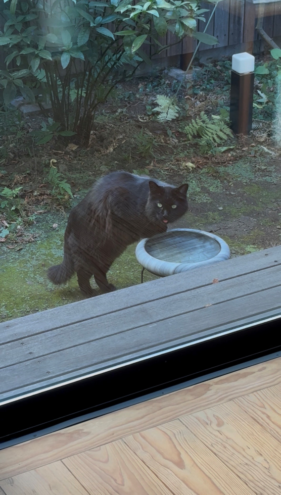朝晩この大きな黒猫ちゃんもお水を飲みに来てくれます。最近では、向こうがこっちを見ているのだなと感じます。私たちが気づくまで座ってこちらも見ていますので。今日も元気だなと思うと安心して癒されます。