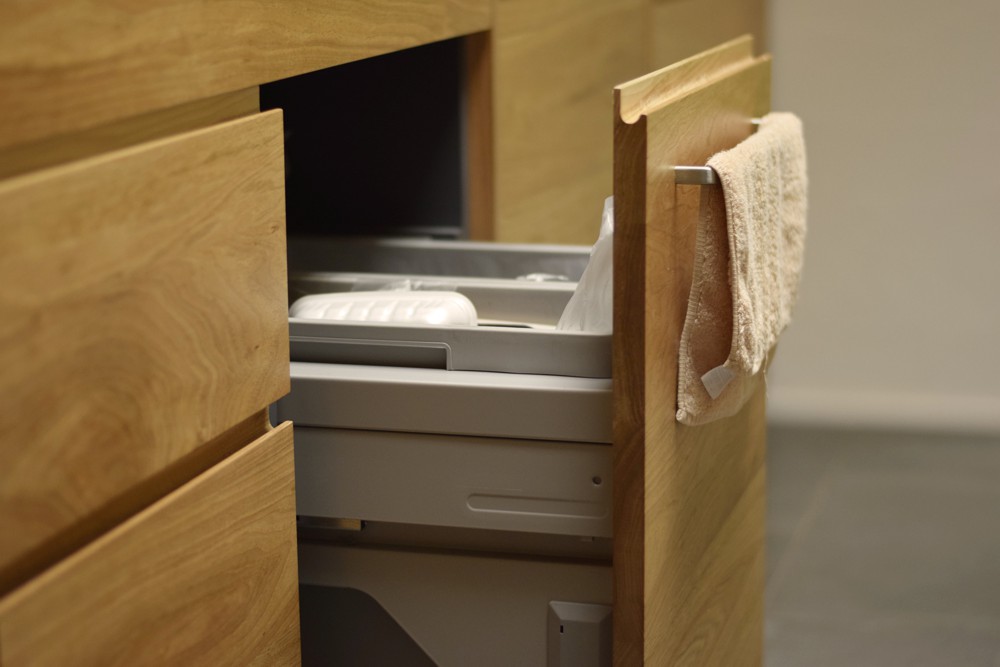 最初は引き出しだけの食器棚だったのですが、お話が進むうちにワインがお好きということが分かって、それならば、とワイングラスやワインが置ける棚も作らせて頂いたのでした。