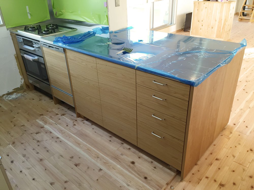 今日は、鶴川のSさんのリフォームの現場に。壁付けのコンロがあるキッチンとシンクがあるアイランドキッチン、そしてダイニングのカウンターと、ボリュームが大きかったので、みんなで現場に。お掛けで今日の分は順調に終わりましたが、まだ原木さんにお願いしている塗装が仕上がってこないので、扉や引き出しの前板は今日はお預け。