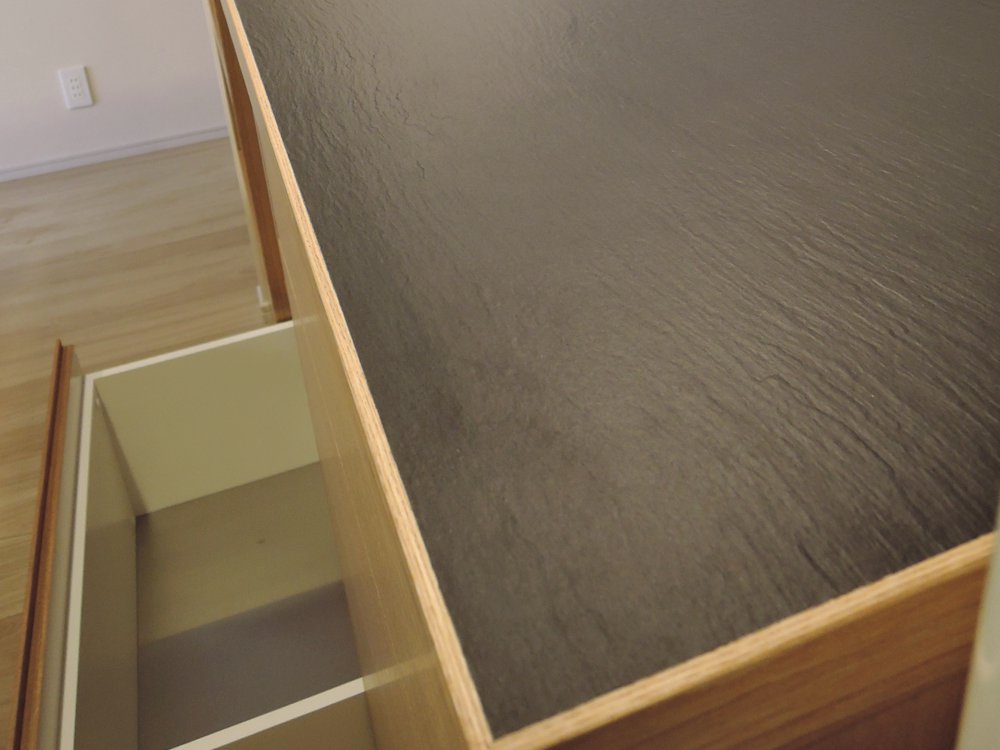 今回初めて使ったのが、このカウンターに使った石のような柄のメラミン。