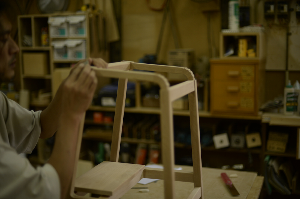 まずはアルダー材を使ってワタナベ君が制作しているところ。小振りな形なので軽量なのですが、強度的に大丈夫かどうか。また座った時の印象がどんな感じになるのか。仕上がってみないと分からない部分があるので、椅子というのは相変わらず難しいのです。