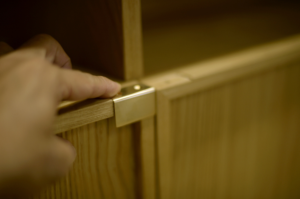 框の幅や引手のサイズもスタディモデルを作りながら、「框はこの幅にするなら真鍮の引手(黄色いテープで養生している部分)も正面から見た時に重たく見えないようにあと1ミリ小さくしましょう。」などとやり取りしながら時間を掛けてこの形を目指してきたのでした。