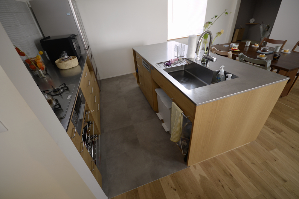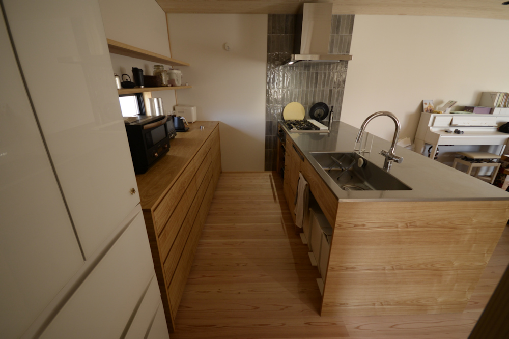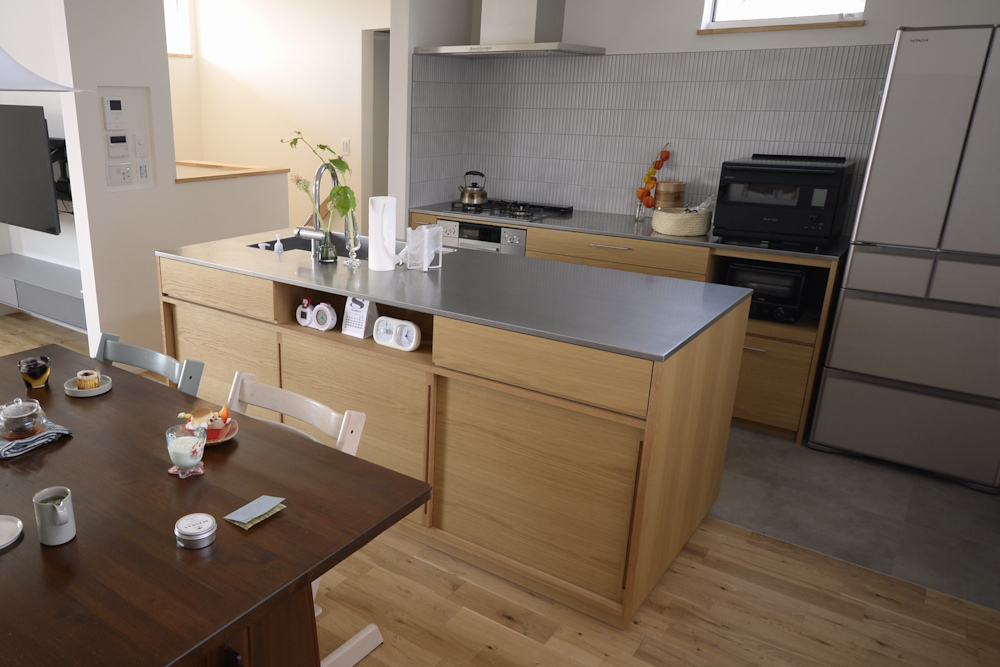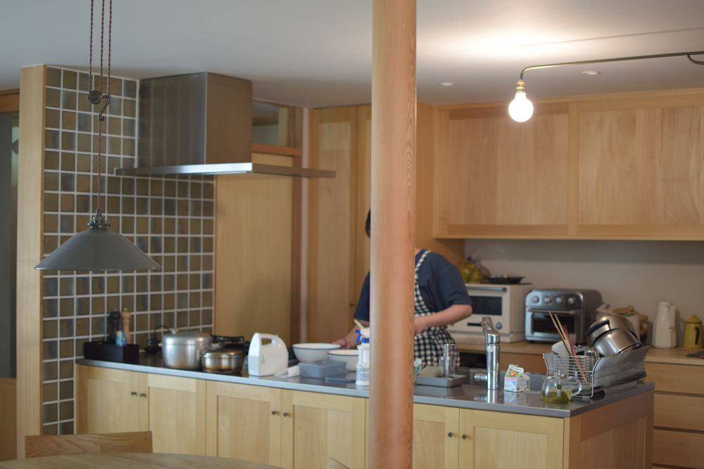 てきぱき進むご主人とおっとりした印象の奥様とのやり取りが軽妙で、このキッチンができあがるまで、とても楽しい時間でした。その自宅に来てくださった際に壁のタイルの様子や外壁の仕上げなどキッチン以外の部分もいろいろと見ていってくださって、その時の印象を取り入れた新居に仕上がっていて、なんだか照れくさくもありうれしくもあり。