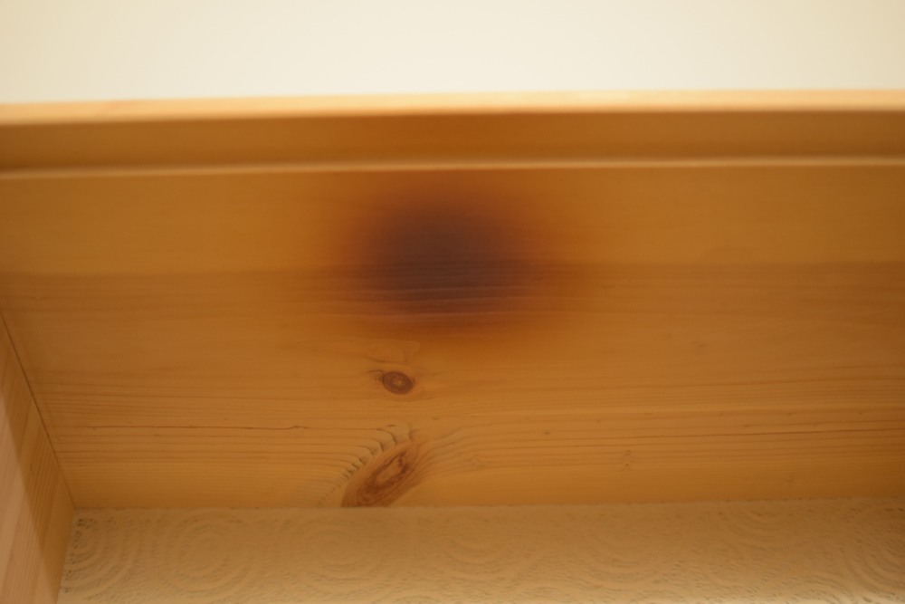 燻されていたのですね。この燻された跡はもう削らないと落とせないと思うので、もうしばらくこのまま様子を見ようと思います。背板の和紙も、もっとひどくなるようなら新しいものに張り替えようと思います。全体的に均一に茶色味が増していったらその表情もかっこよさそうですが、どうなるでしょうか。