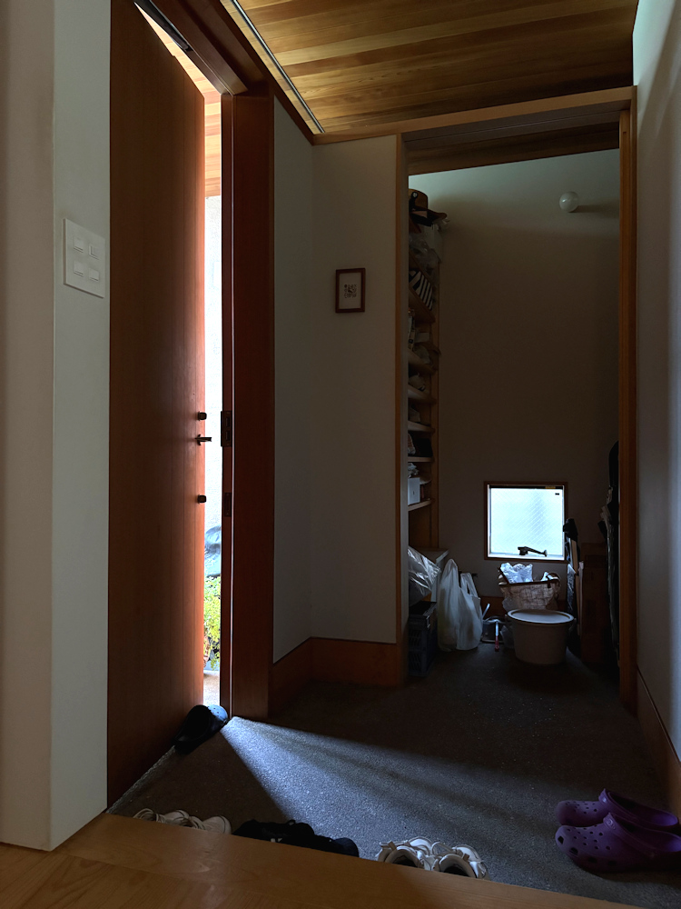 建物の反対側にはお風呂場があるので、玄関のこの換気窓を開ければ、間にあるキッチンの通気ができると福原さんが考えてくれました。明り取りにもなるしね、ともお話しされていたと思います。ありがとうございます。