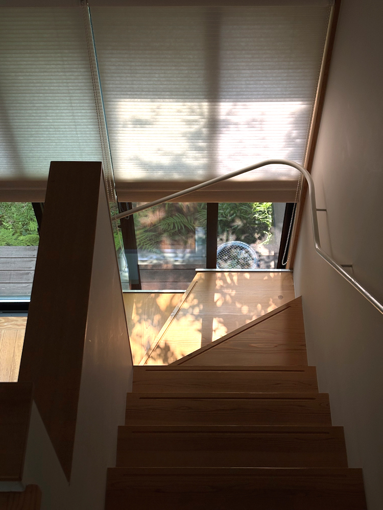 朝の階段。身支度を終えるまでは半分くらいしかシェードは上げないようにしています。見苦しいので。(笑)