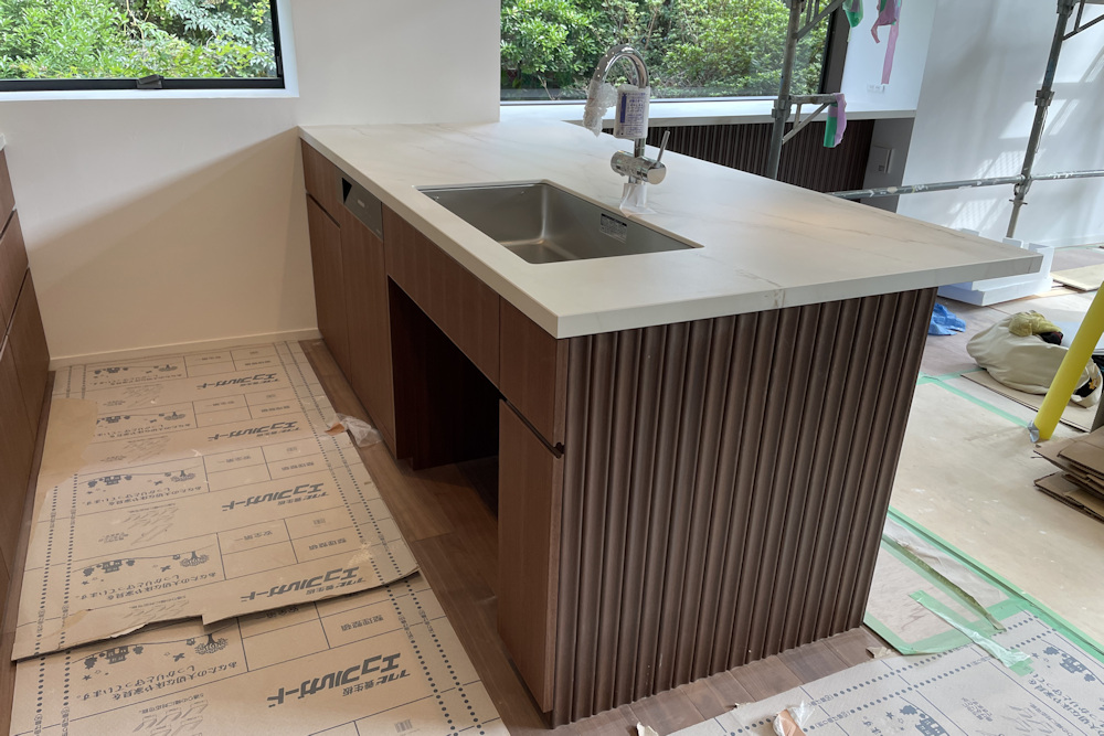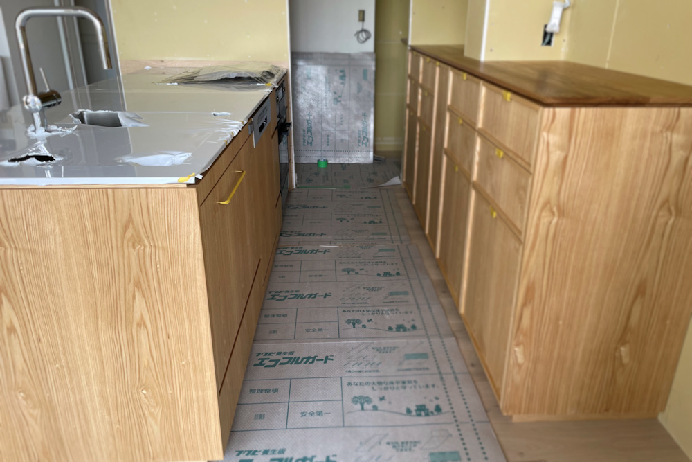 リノベーションですので、ちょっと変わった間取りになっていまして、右壁の奥が不思議と壁に囲われたスペースになっていまして、普通のI型キッチンだと変に隙間ができてしまうということで、ほんのりL型のワークトップになっているのです。
