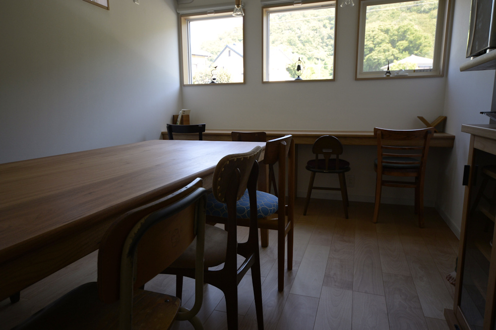 お引っ越しから少し時間が経ってご新居での暮らしはひと段落されたようですが、まだカフェのオープンまではもう少しという感じで、アイランドカウンターは暮らしの様子をそこかしこに拝見できましたが、お店のテーブルはまだ真新しく座る人たちを今かと待ち望んでいるかのようです。