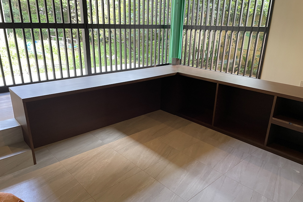 今回、マンションのリノベーションということで、エレベータに納まらない天板とダイニング側のキャビネットの搬入を階段をぐるぐる回って荷揚げしたり短時間ではありますが、けっこうな数の家具をエントランスから揚げさせて頂いたりと、朝から賑やかに作業させて頂きましたが、住人の皆様はにこやかにご挨拶してくださったり、目の前が公園でゆったりした気持ちでできたり、と、リノベーションの施工会社さんであるFINDさんが細かく気を配ってくださり、また現場でも的確に段取りを寸法出しをしてくださったおかげで、とてもスムーズに作業をすることができました。