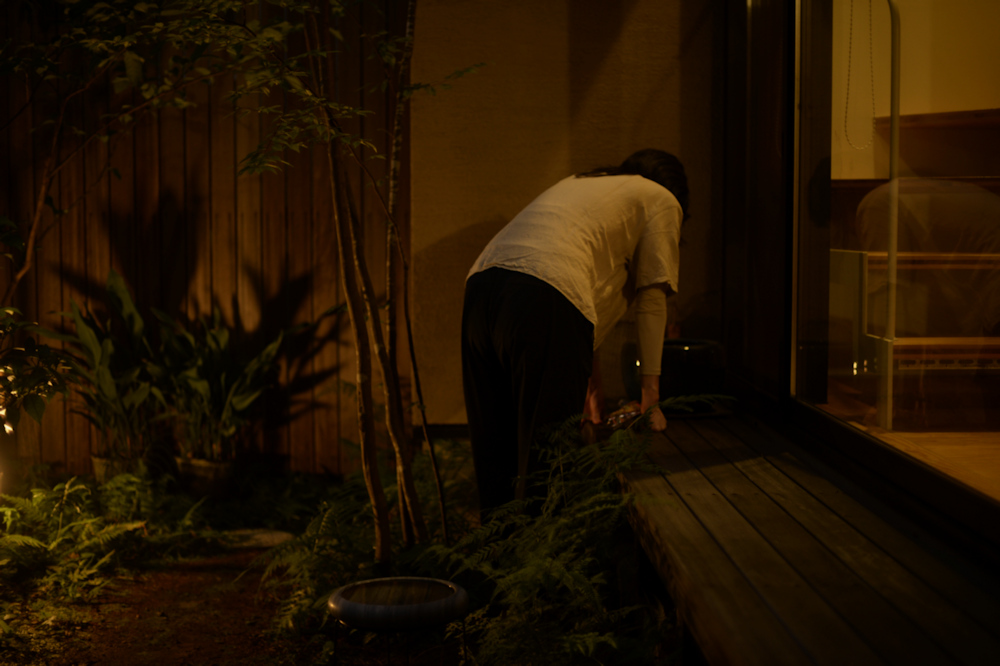 家に到着すると、ふいに蒸してきた庭の空気を見てアキコは慌ててメダカに日除けを施して、この日差しのうちにとソファーのカバーは洗われてサラサラさらされます。