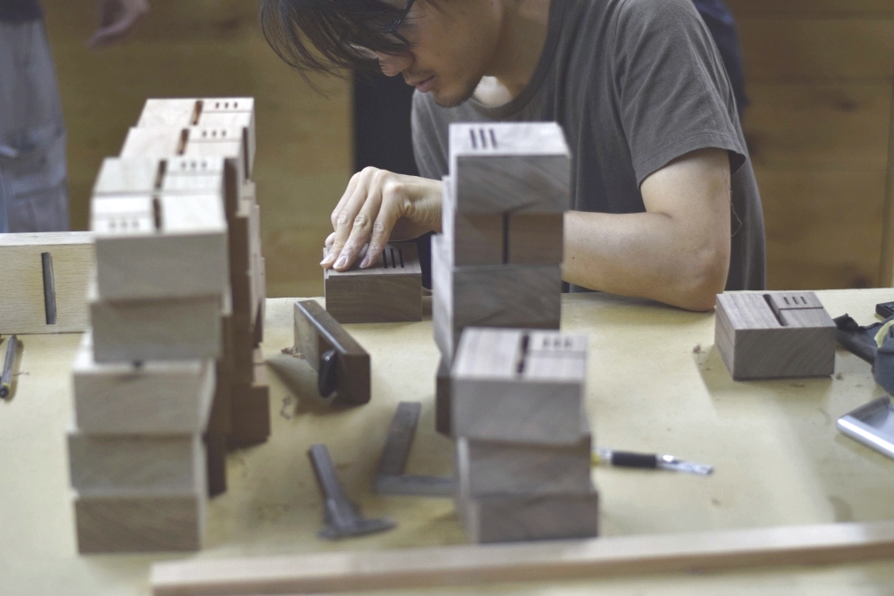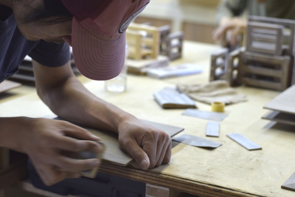工房での作業内容はカナイ君を中心にスタッフのみんなに考えてもらっているのですが、芯組みでタッカーを使う作業・木工機械を使って部材を作る作業・木栓でねじを隠す作業を午前と午後でローテーションしてそれぞれみんなが体験できるように考えてくれました。