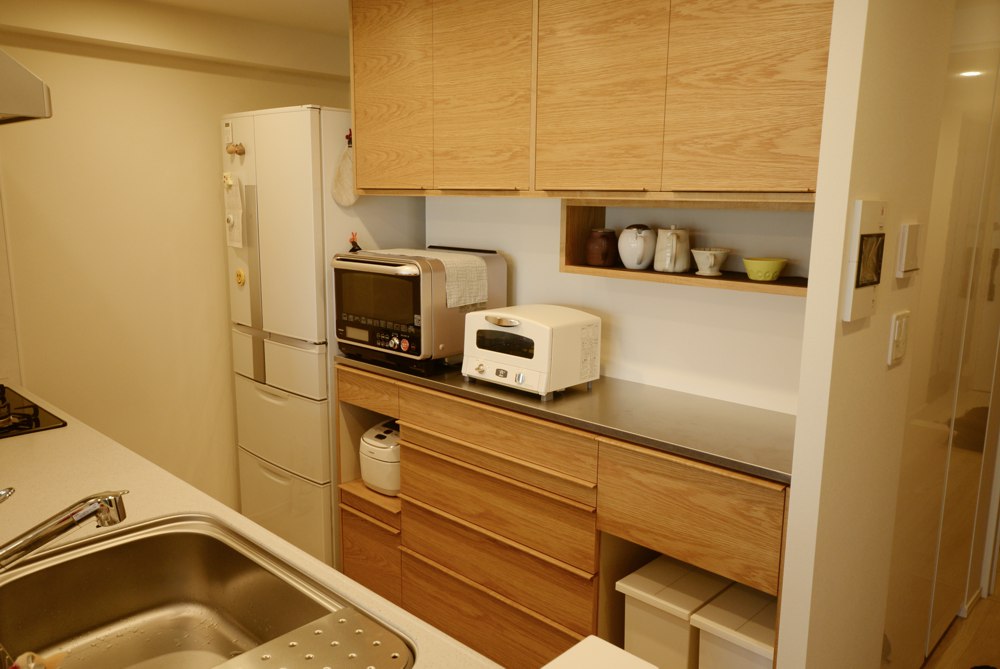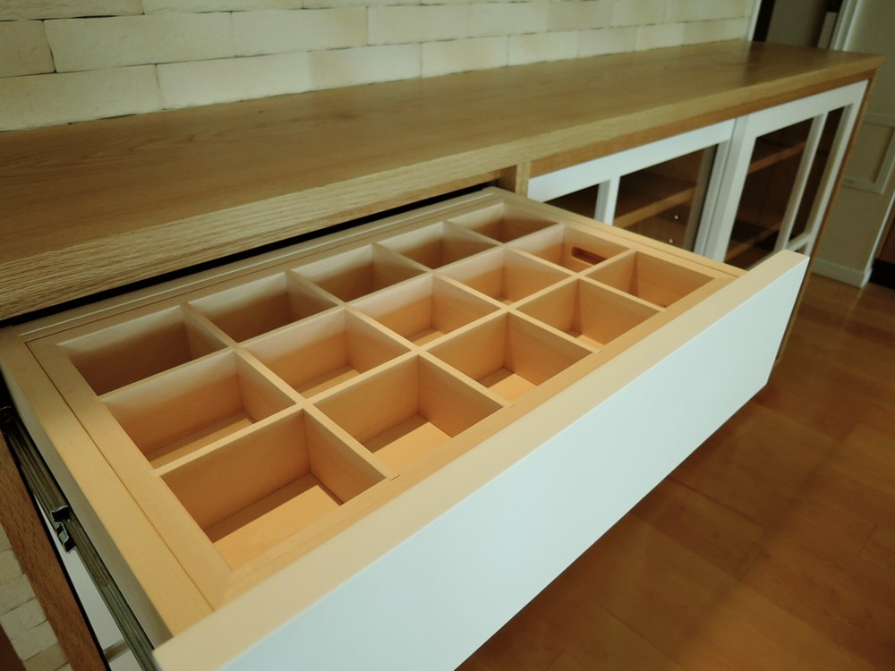 Tさんから最初頂いていたメールには、「ヒュルスタのキャビネット(写真の奥に写っている大きな引き戸と引き出しのキャビネット)に合わせたデザインでカップボードを作りたいのです、と書かれていたのです。お話を進めるうちに、しまうものの量を考えて同じデザインで吊戸棚を作り、さらには、リビングから見た時に印象をまとめられるようにと、マンションお引き渡し時に作りつけたといいう食器棚の表面材もナラ材に変えて、白いマットな塗装で仕上げた部分とナラ材の二つ色を組み合わせた家具たちができあがりました。