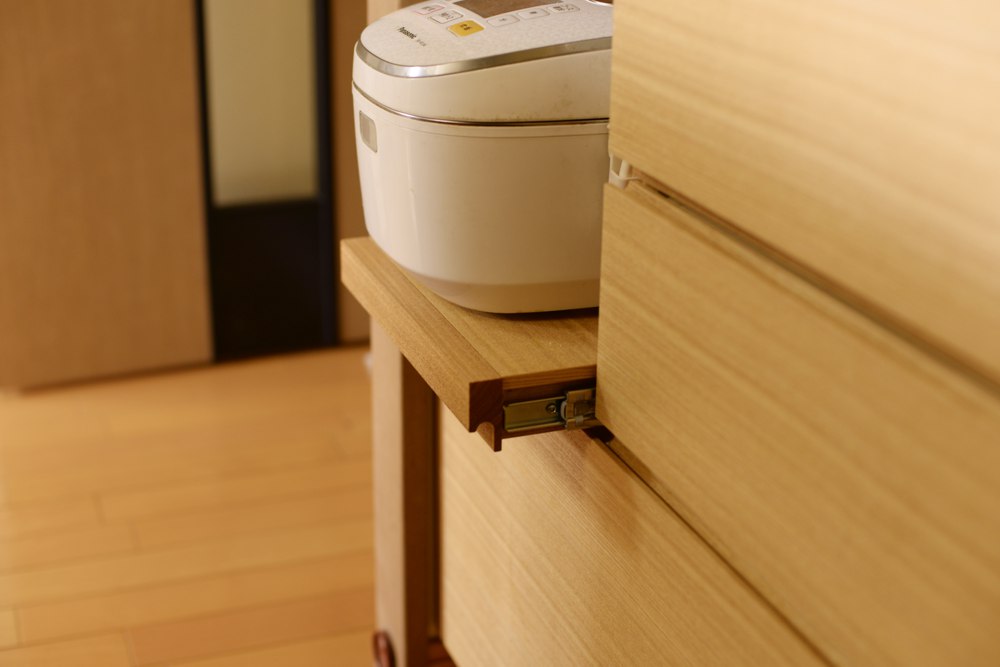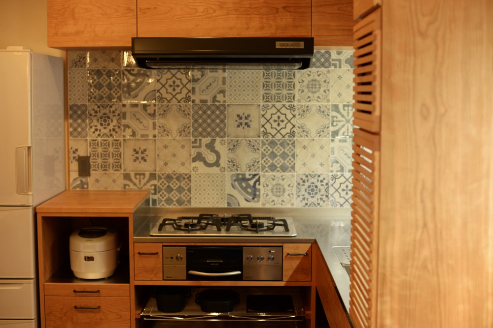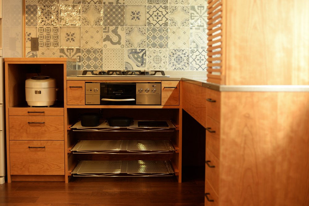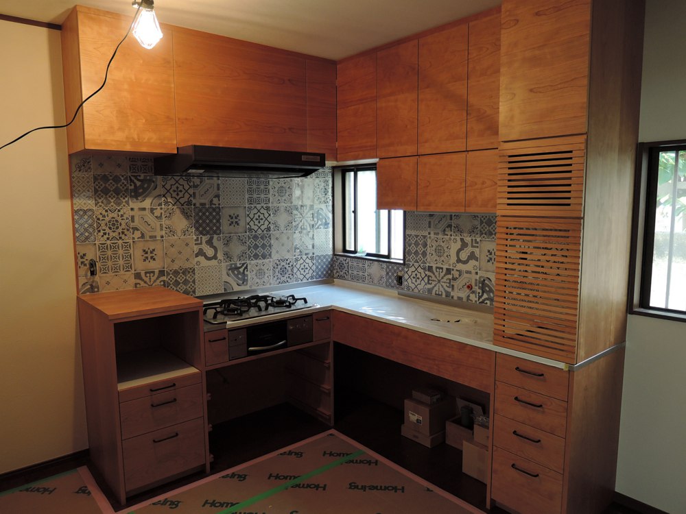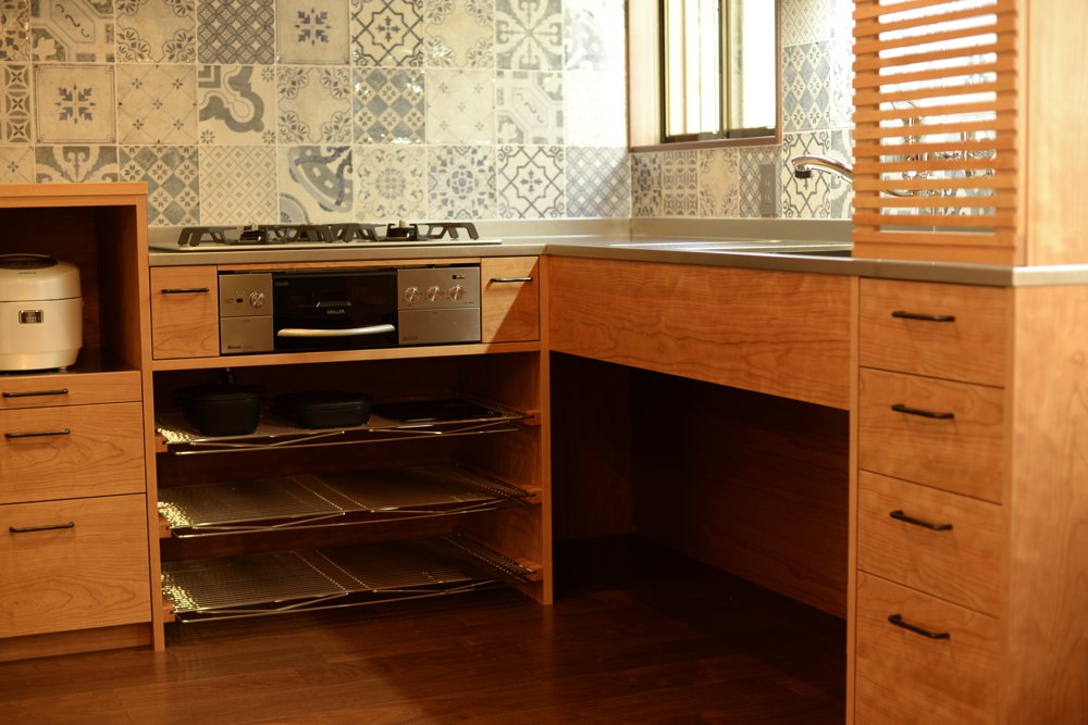 そして、天板とオープン棚だけチェリーを使う形にして、とても明るい印象でまとめることができたのでした。