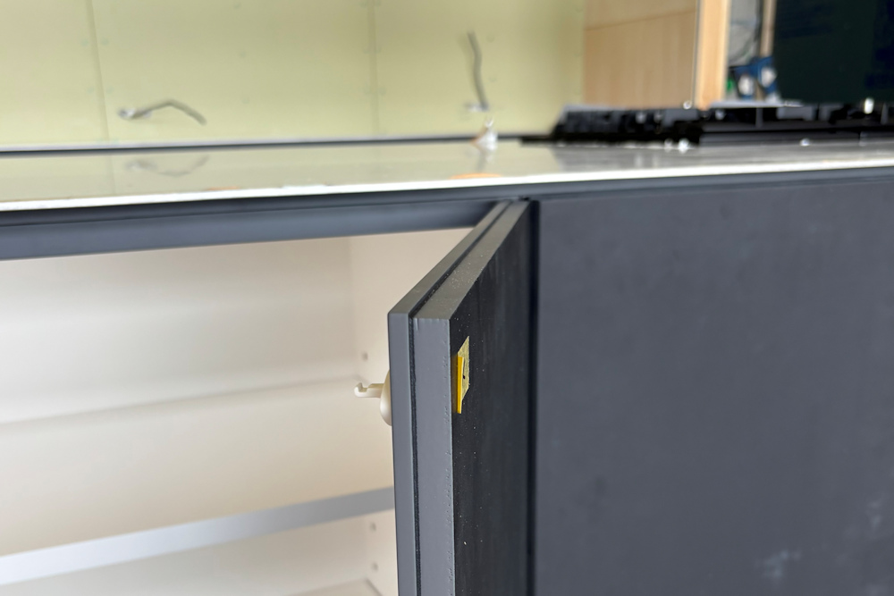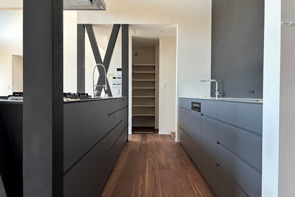 表面材は化粧板ではなく、ツヤを抑えて木目を表さないで濃いグレーに塗装して仕上げています。塗装で塗り包む良さは、化粧板だと表現しづらい角の当たりの柔らかい印象になること。優しい印象になるのですよ。