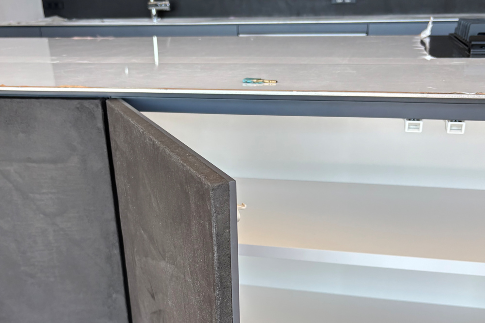 そして、リビングダイニング側は設計士さんの意図でモールテックス仕上げ。筋交い越しに見える側面もモールテックス仕上げ。ここで気になるのはモールテックスをどこで見切るか。塗装と同様に塗り包むと良い表情になるのですが、塗りっぱなしではポロポロ崩れちゃうので、どこかでモールテックスをぶつけて止めないといけない。モールテックスの施工については、餅は餅屋ですから左官屋さんに仕上げて頂きます。どのくらいの厚みがつくのかを打ち合わせしておきまして、今回は扉の小口で見切れるように2ミリの厚みを見越して表面と裏面のサイズを変えて作っております。側面もそう。見付けは塗装仕上げで、側面に2ミリの厚みがつけられるように柱で隠れる部分で側板の厚みを変えています。