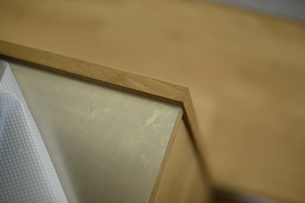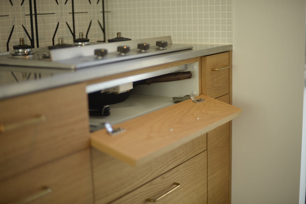 素材は内田さんのいつものテイストということホワイトオークとステンレスの組み合わせになり、ちょっと変わったところとしては食器棚にエアコンを組み込むことくらいでしたが、このレイアウトも内田さんとのお仕事では何度か経験している形なので、揉んだくなく収まりそうです。