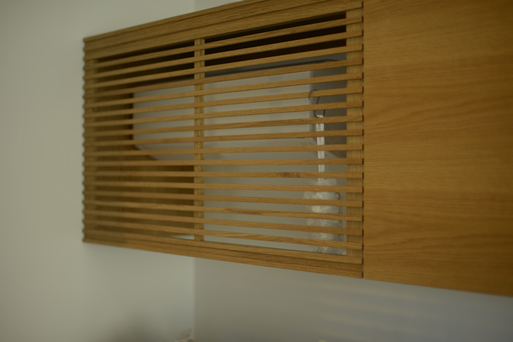 「ステンレスバイブレーションとホワイトオークの壁付けキッチンとエアコン用格子扉のある食器棚」