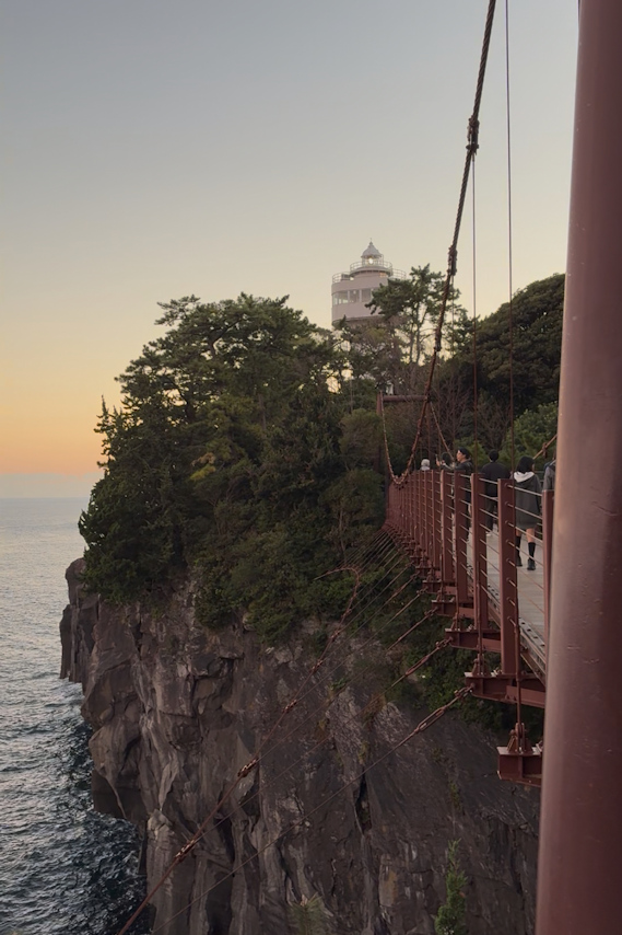 観光客の人でいっぱいで、駐車場に入る直前が混んでいて日の入りに間に合いませんでしたが、夕暮れの吊り橋も雰囲気があったのでよかったです。昔もっと大きくて長くて怖いイメージがあったのですが、自分の記憶を直す機会となってよかったです。