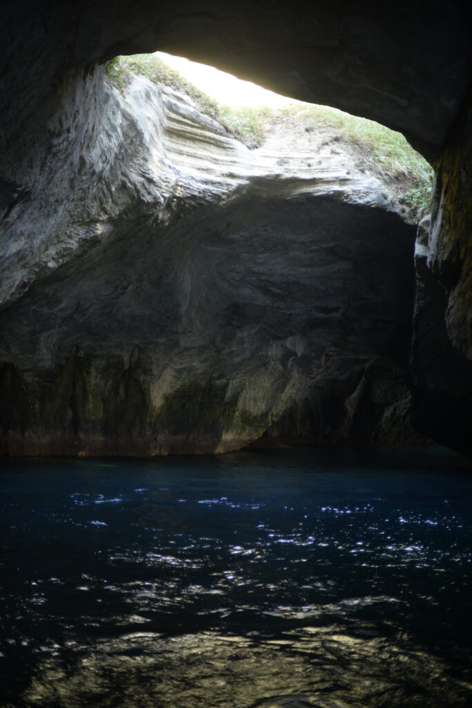はじめに結構沖へ出て、海から陸地を見渡すことができました。海からはこう見えているのかと知れてよかったです。海の上は気持ちが良いですね。(ダイスケさんはすぐに酔ってしまうので、船酔い大丈夫かしら)その後、青の洞窟へ。