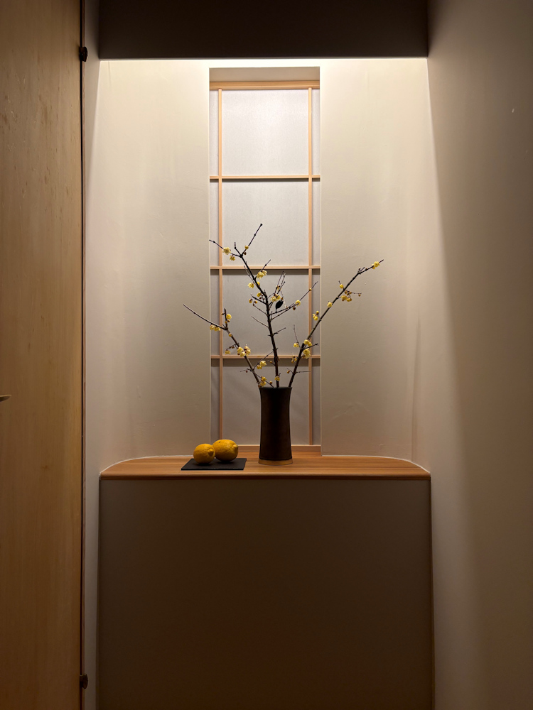 玄関の洞床。こういう季節のものを飾るスペースとして重宝していて、西側で窓の側で普段日陰なので、お花は長持ちするので、リビングよりもお花はここに飾ることが多い我が家です。