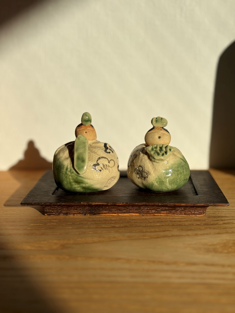 会社のショールーム入り口に毎年飾るのは、ダイスケさんのおばあさまが陶芸を趣味にされていらしたので、昔作られた陶器のお雛様です。