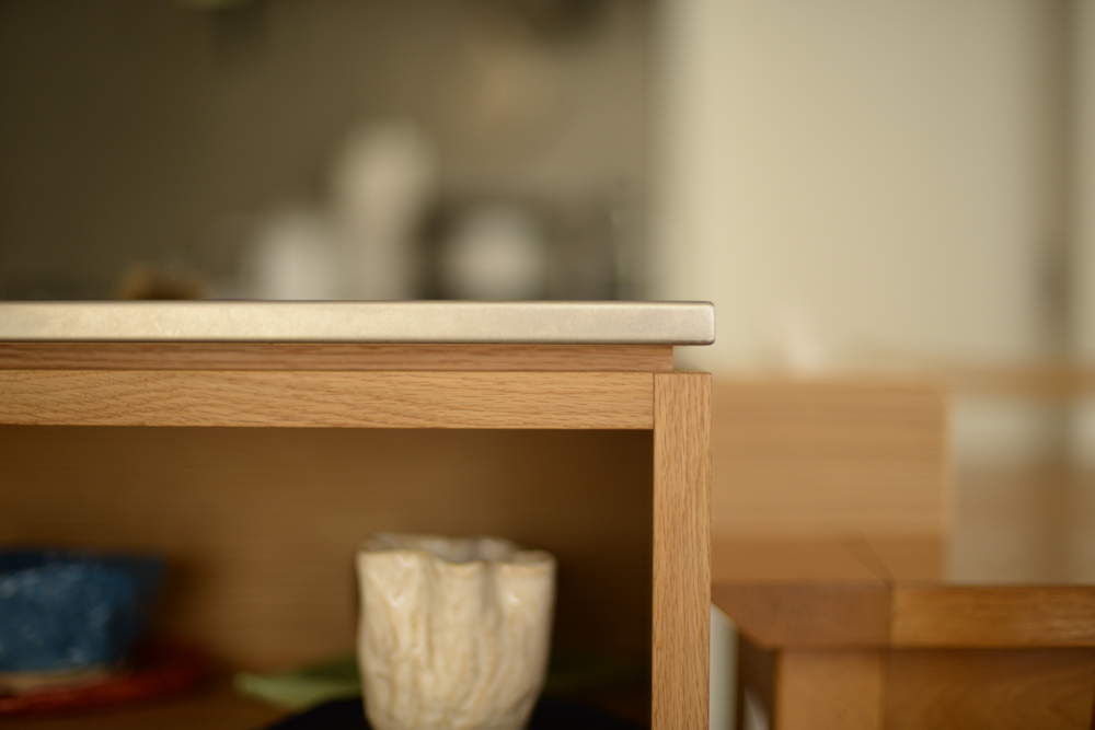 「ナラ板目突板とステンレスバイブレーションのセパレートキッチン」