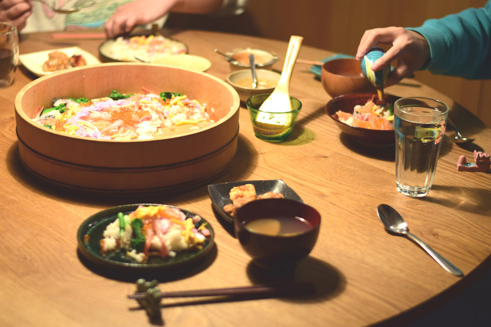 ちらし寿司はチイがよそってくれました。年に一度しか寿司桶に飾り付ける盛り付けはしないので、