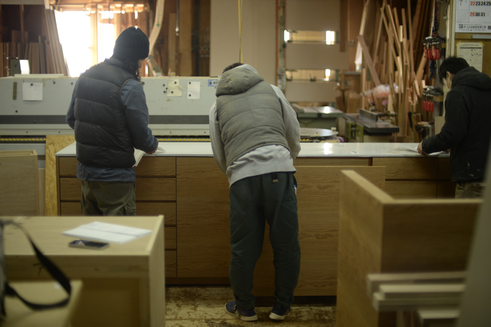 3700ミリ近い大きなキッチン。この長さになると、突板の木目をどのように見せるか悩みどころです。コストのバランスを考えて通常の6尺ものを使うのですが、3700ミリの長さでは完全に木目はつながりません。