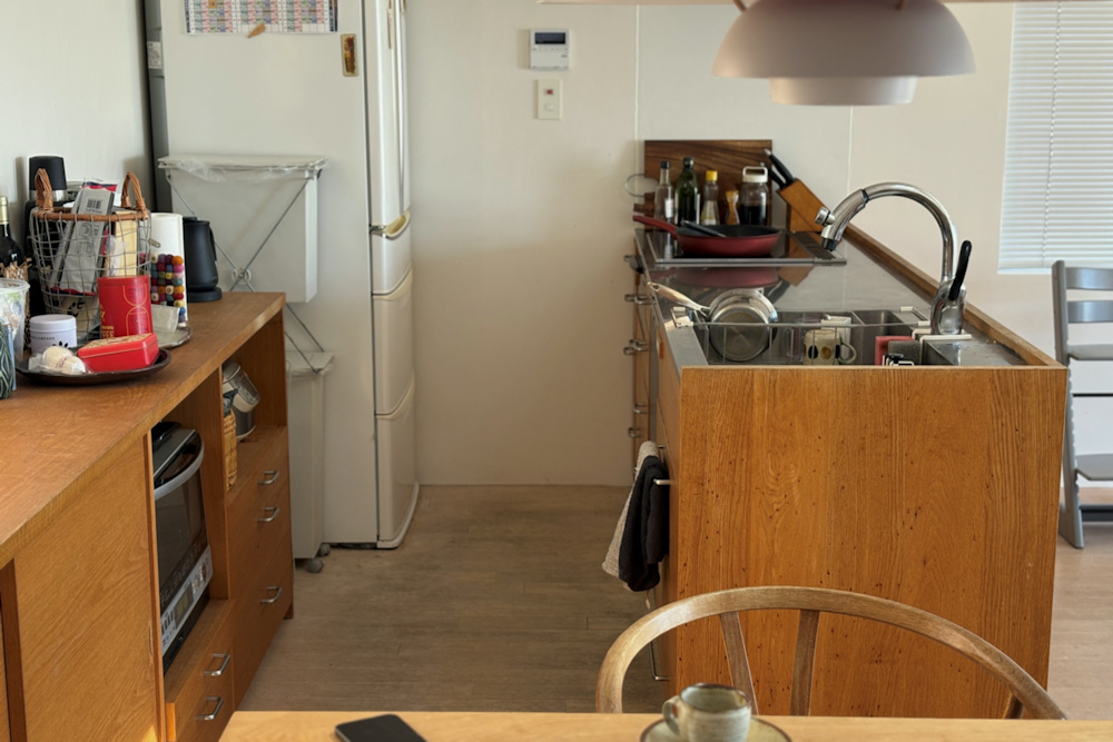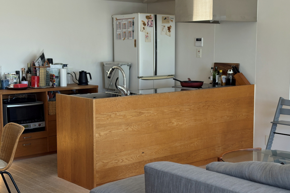 まだキッチンを作り始めて数年しか経っていなかった頃に若い仕上がりがそこにありました。ナラはすっかり良い色になっていて、そこかしこにくたびれた様子も見られましたが、「すべてが愛おしいんですよ。」とIさん。うれしいなあ。